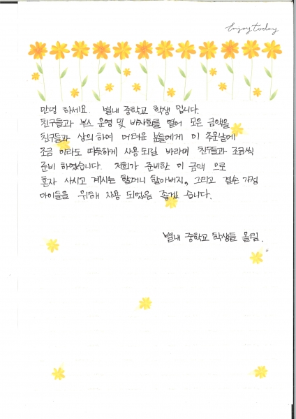 [금요저널] 남양주시 별내면은 지난 22일 별내중학교 2학년 학생들이 독거 어르신 및 결손가정 아이들을 위해 사용해 달라며 바자회 수익금 682,500원을 기탁했다고 밝혔다.