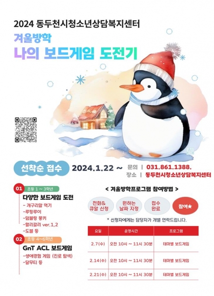[금요저널] 동두천시 청소년상담복지센터는 겨울방학을 맞이해 관내 초등학생을 대상으로 ‘2024 겨울방학 프로그램 - 나의 보드게임 도전기’를 개설한다고 밝혔다.