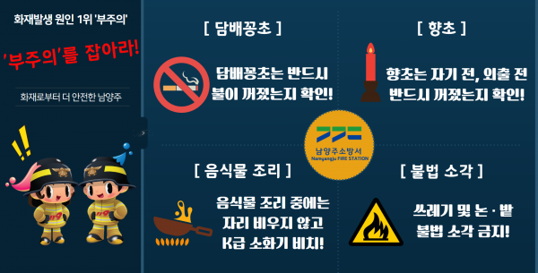 조창근 서장은 “겨울철 화재 발생 현황을 분석한 결과 부주의에 의한 화재가 상당한 만큼 화기 취급 시 안전에 더 각별한 주의를 기울여야 한다”며 “화재예방 홍보 및 겨울철 화재안전대책 추진을 통해 남양주시민의 생명과 재산을 보호하는데 최선을 다하겠다”고 전했다.