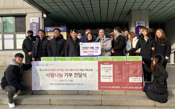 최지훈 ㈜와치캠 대표는“부천시다문화가족지원센터 대상자들에게 필요한 물품이 무엇일지 고민하다가 추운 겨울을 조금 더 따뜻하고 행복하게 지내시길 바라는 마음에서 이번 후원 물품을 준비했다”며 “앞으로도 매년 다양한 사회공헌활동을 통해 지역사회와 함께 성장하며 청소년들에게 선한 영향을 줄 수 있는 기업이 되도록 노력하겠다”고 말했다.