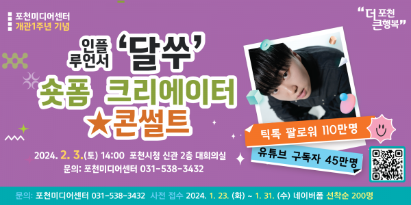[금요저널] 포천미디어센터는 오는 2월 3일 포천시청 신관 2층 대회의실에서 겨울방학과 미디어센터 개관 1주년과 겨울방학을 맞아 인기 크리에이터 달쑤의 초청 콘서트 ‘숏폼 크리에이터 콘썰트’를 개최한다.