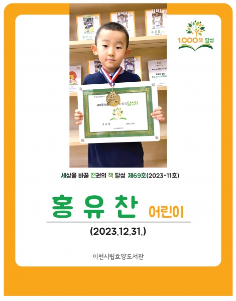 세천책 읽기를 완주하게 되어 열심히 책 읽은 보람을 느꼈다는 69호 달성의 주인공 홍유찬 어린이 어머님은 “주위의 권유로 세천책을 시작하게 됐고 책을 읽으며 엄마와 교감을 할 수 있어 좋았다”, “꾸러미 책 중 읽어본 책이 나오면 반가웠고 전에 읽었던 기억을 떠올리며 이야깃거리가 풍부해져서 좋았다.