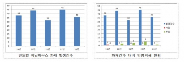 남양주소방서 관내 주거용 비닐하우스에서 발생한 화재는 최근 5년간 전체 1,984건 중 195건으로 연평균 39건이며 이는 경기도내 연평균 29건보다 34.5% 높다고 밝혔다.