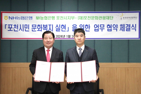 [금요저널] 포천문화관광재단과 NH농협 포천시지부는 지난 24일 포천반월아트홀에서 ‘포천 시민 문화복지 실현’을 위한 업무협약을 체결했다.