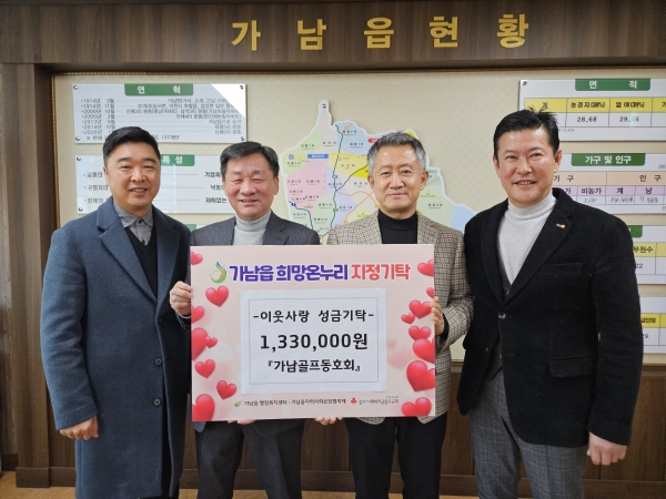 이복환 가남읍장은 “고물가 시대에 경기가 어려운 가운데 이웃을 향한 온정을 선뜻 전달해 주신 가남골프동호회 회원 일동에게 감사드린다 회원들의 뜻에 따라 관내 복지사각지대에 놓인 위기이웃을 적극 발굴해 사업 추진에 만전을 다하겠다”고 말했다.