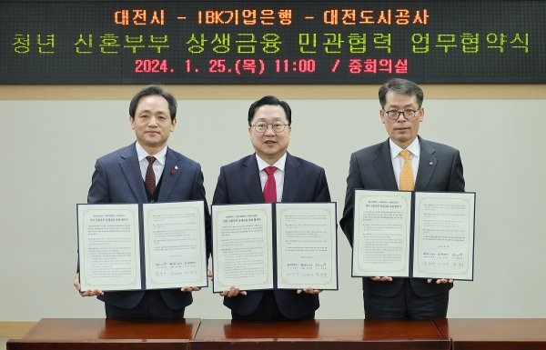 대전시는 25일 이장우 대전시장과 김성태 기업은행장, 정국영 도시공사 사장이 참석한 가운데 ‘청년 신혼부부 상생금융 포괄 민관협력 업무협약’을 체결했다.