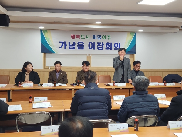 이 날 이장회의에서는 2024년 1월 자동차세 연납, 2024년 깨끗하고 밝은 가남읍 만들기 추진, 2024년 설 정 나눔 꾸러미 사업, 2024년 보훈수당, 부정수급 예방 및 신고제도, 어르신 폐렴구균 무료 예방접종, 여주시 청년 창업자 임차료 지원사업, 수도 요금 및 하수 요금 인상 및 개편, 제설함 수요조사, 2024년 마을공동체 주민제안 공모사업 신청, 2024년 여주시 농업발전기금, 2024년 경기임산부 친환경농산물 지원사업, 당면 영농사항 등 시·읍정 사항을 안내했다.