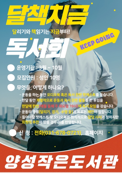 [금요저널] 안성시 양성작은도서관은 1월 29일부터 달리기와 책읽기를 함께 하는 ‘달책지금’ 독서회의 참가자를 모집한다.