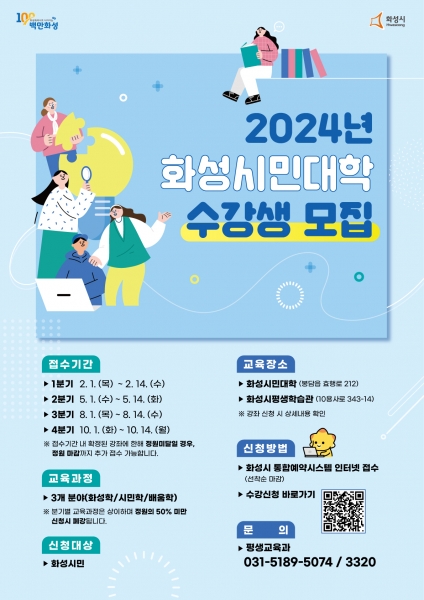 신용선 평생교육과장은 “화성시민 모두가 누릴 수 있는 배움의 기회를 제공하고자 다양하고 유익한 교육과정을 구성했다”며 “관심 있는 분들의 많은 참여를 바란다”고 전했다.