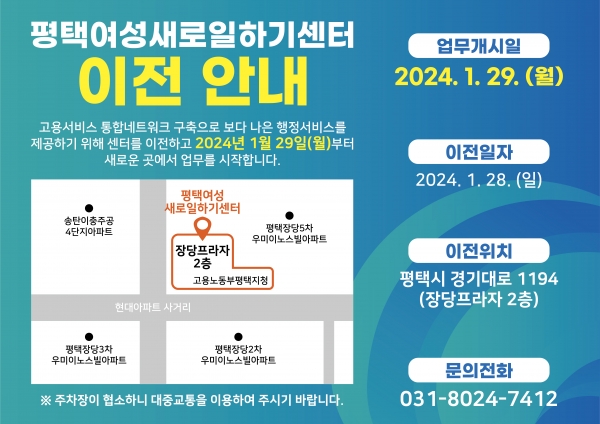 [금요저널] 평택시는 오늘 29일 평택고용서비스 통합네트워크센터 구축을 위해 평택여성새로일하기센터를 이전한다고 밝혔다.