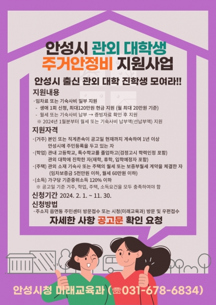 2024년 안성시 관외 대학생 주거안정비 지원은 1월부터 12월까지 진행하는 사업으로 지원 대상은 안성시 출신 타지역 대학 진학자이며 거주, 학업, 주택, 소득의 각 조건이 모두 충족해하 한다.