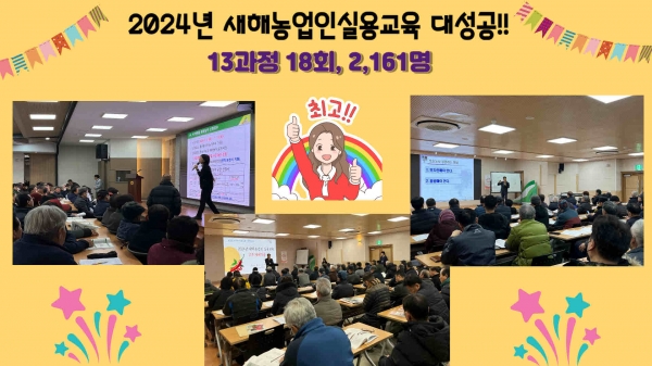 새해농업인 실용교육은 3주간 13과정, 18회를 진행했으며 그 결과 농업인 2,102명이 교육에 참가하는 성과를 얻었다.