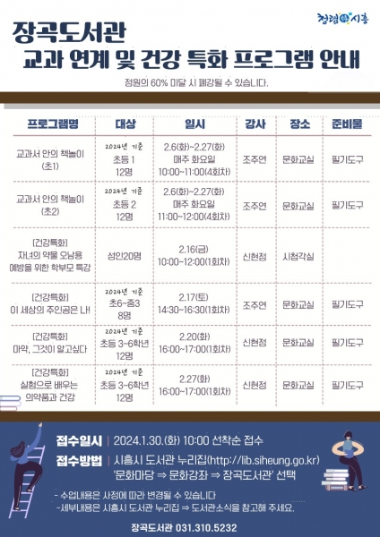 [금요저널] 시흥시 장곡도서관은 새 학년을 준비하는 2월을 맞아 초등 저학년을 위한 교과연계 독서 프로그램과 청소년 및 시민을 위한 건강 관련 특화 프로그램을 운영한다.