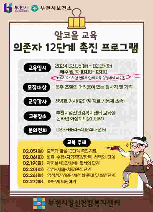 [금요저널] 부천시와 부천시정신건강복지센터는 오는 2월 5일부터 27일까지 ‘의존자 12단계 모델’을 주제로 알코올 교육을 추진한다.