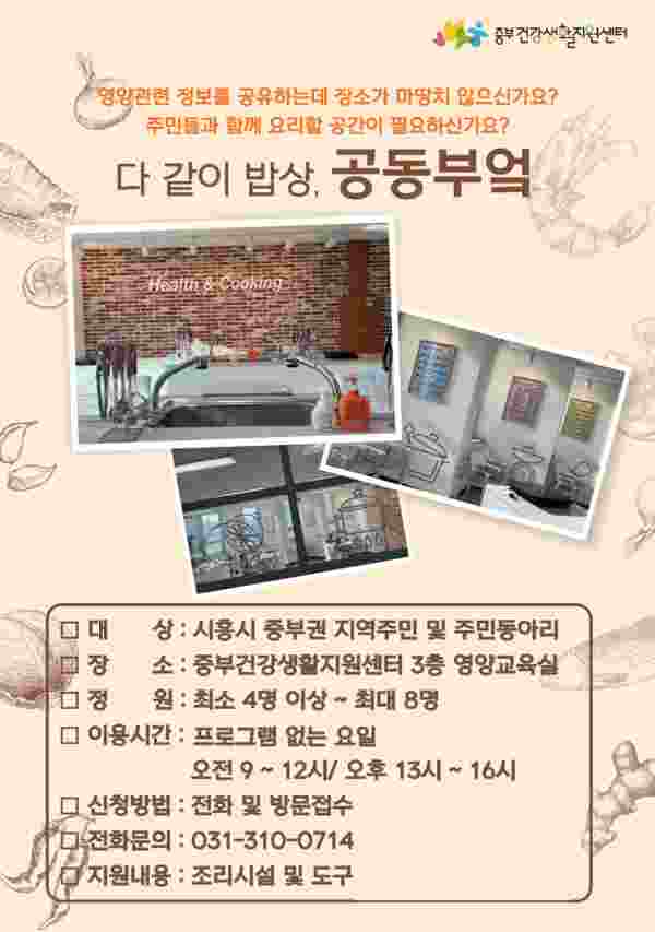 [금요저널] 시흥시보건소 중부건강생활지원센터는 중부권 지역주민과 주민동아리 등 공동체가 모여 함께 음식을 만들 수 있도록 센터 내 조리실습실을 대여해 주는 ‘다 같이 밥상, 공동부엌’ 사업을 운영하고 있다.