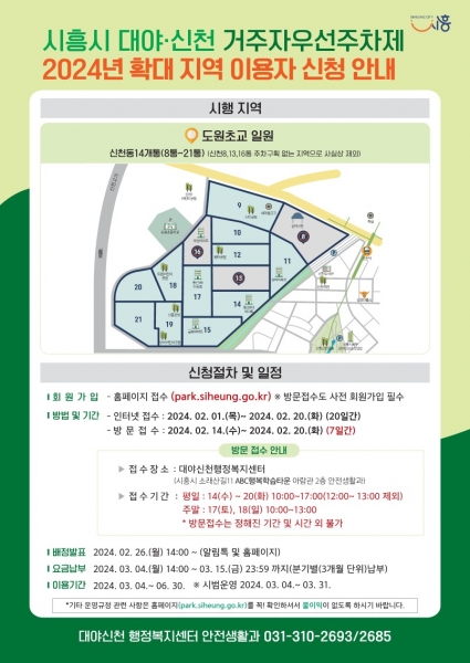이명기 대야동 안전생활과장은 “거주자우선주차제가 신천동 도원초교 일원에 확대 시행되면 주차면의 이용 회전율이 높아지고 장기 무단 방치 차량이 근절되며 무단 점유로 인한 지역주민 간 분쟁이 해소돼 더 많은 주민이 주차 편의를 누릴 수 있을 것으로 기대된다”고 말했다.