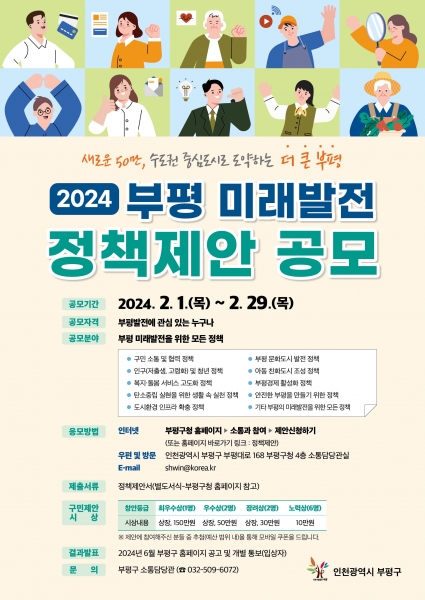 [금요저널] 50만 구민 여러분의 아이디어가 부평의 정책이 된다 부평구는 2024년도 ‘부평 미래발전 정책 제안 공모’를 1일부터 29일까지 2월 한 달간 실시한다.