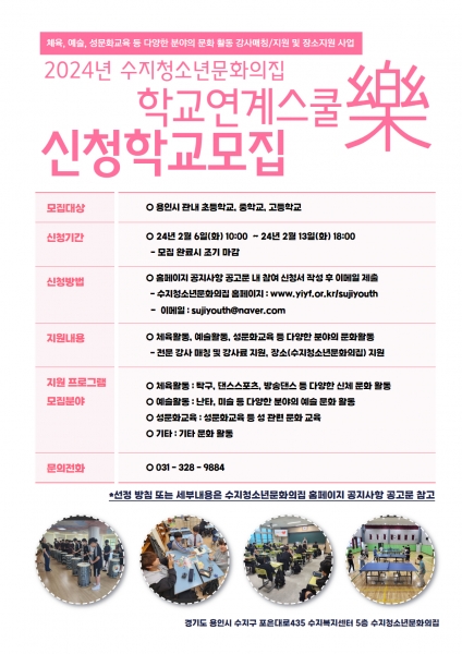 [금요저널] 용인시청소년미래재단 수지청소년문화의집에서는 지역 학교와 연계해 청소년들의 문화 활동을 지원하는 ‘학교연계스쿨樂’ 사업 참여 학교를 오는 2월 6일 10시부터 13일 오후 6시까지 모집한다.