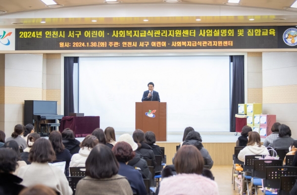 [금요저널] 인천광역시 서구가 위탁 운영하는 인천서구 어린이·사회복지급식관리지원센터는 지난 1월 30일 강범석 서구청장과 등록시설 원장 및 시설장 등이 참석한 가운데‘2024년 사업설명회 및 원장·시설장 대상 집합 교육’을 인천서구청 대회의실에서 실시했다.