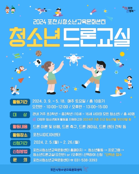 [금요저널] 포천시 청소년교육문화센터는 차세대 무인 항공기의 다양한 기술과 사고를 지닌 창의적 인재 양성을 위해 2024년 청소년 드론 교실에 참가할 청소년을 2월 5일부터 26일까지 모집한다.