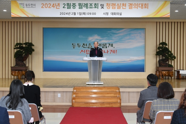 월례조회는 박형덕 동두천시장, 김동균 명예시장과 전 직원이 참석한 가운데 식전 행사로 세무과 유형준 주무관의 재능기부로 ‘시 낭송’이 있있다.