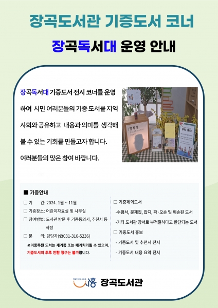 [금요저널] 시흥시 장곡도서관은 2024년 시민들이 기증한 도서를 소개하고 나눔의 의미를 되새기는 기증도서 전시 코너 ‘장곡독서대’를 운영한다.