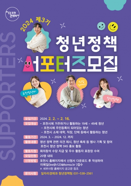 [금요저널] 포천시 일자리경제과에서 다음달 16일까지 청년이 참여하고 주도하는 청년정책 추진을 위한 ‘2024년 제3기 포천시 청년정책 서포터즈’를 모집한다.