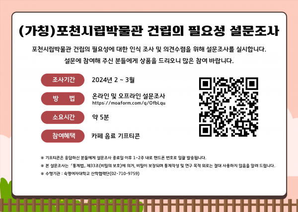 이번 설문조사는 ‘포천시립박물관 건립 타당성 및 기본계획수립 용역’ 추진의 일환으로 2월부터 3월까지 2달간 진행할 예정이다.