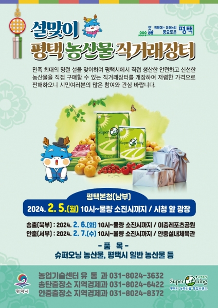 [금요저널] 평택시는 다가오는 민족 최대의 명절 설을 맞아 생산자와 소비자 상생의 장을 위한 ‘2024년 설맞이 직거래장터’를 실시한다고 밝혔다.