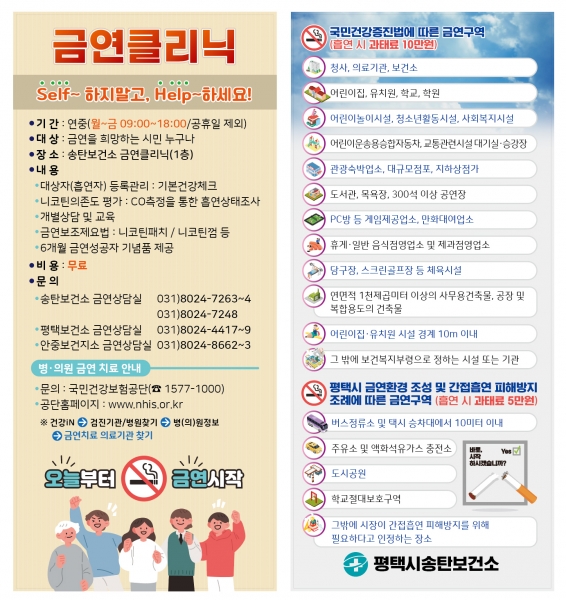 지정된 금연구역은 ‘국민건강증진법’에 따른 청사, 어린이집, 학교, 의료기관, 음식점 등 공중이용시설 및 ‘평택시 금연환경 조성 및 간접흡연 피해방지 조례’에 따른 도시공원, 학교보호구역, 버스정류소 및 택시승차대 등이다.