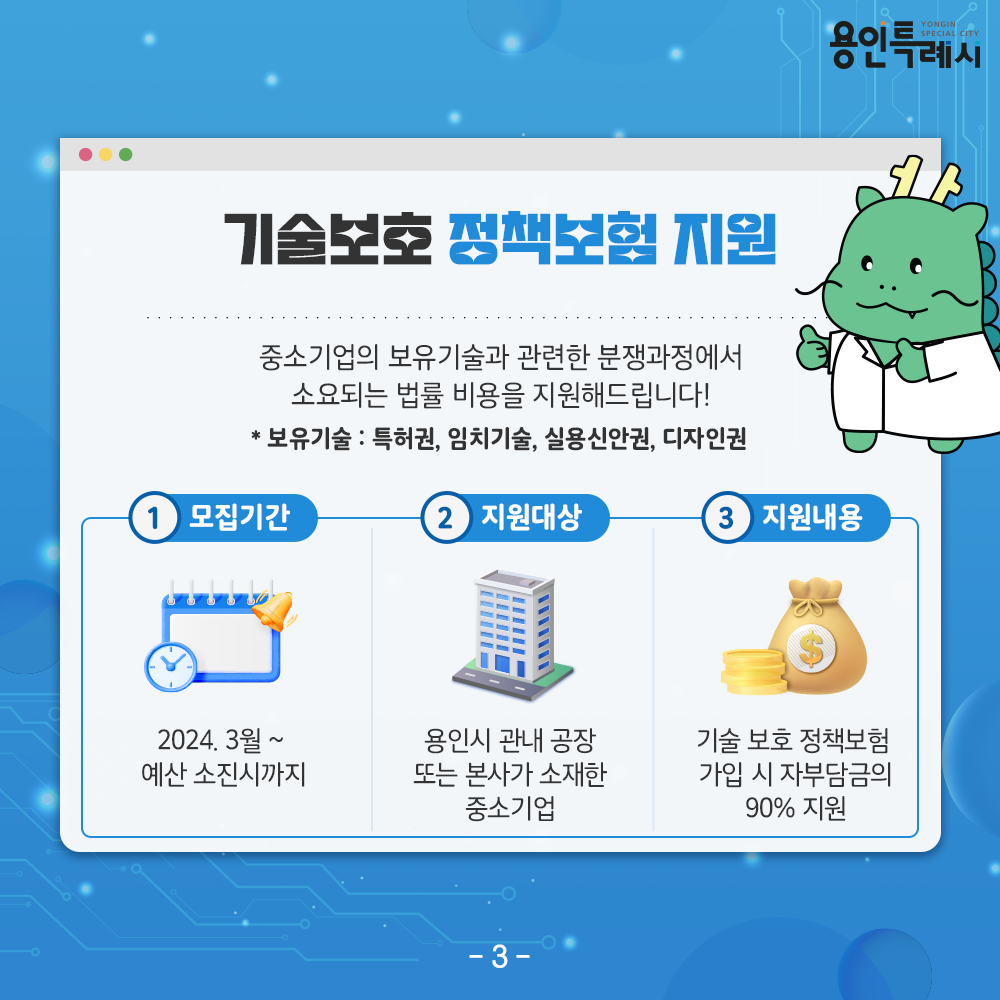 이와 함께 중소기업이 보유한 기술과 관련한 분쟁이 발생했을 때 법률비용을 지원하는 ‘기술 보호 정책보험 지원’도 안내하고 있다.