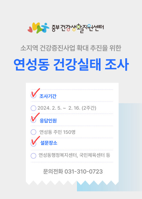 소지역 건강증진사업 실태조사 또는 건강 중재 프로그램에 관심 있는 시민이라면 중부건강생활지원센터 건강관리팀으로 문의하면 된다.