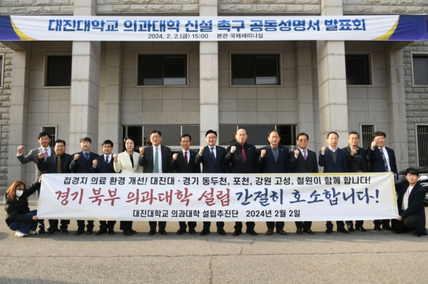 이날 공동성명은 대진대학교 의과대학 설립추진단 주관으로 경기 북부의 동두천·포천, 강원 북부의 고성·철원 지자체장과 의회 의장, 지역 국회의원, 대통령 직속 강원특별자치도 지방시대 위원장들이 동참해 진행했다.