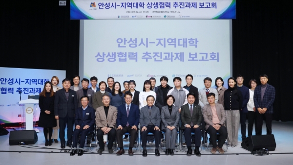 이날 보고회는 안성시장을 비롯해 한경국립대 총장, 중앙대 산학협력단 부단장, 동아방송예술대 총장, 두원공과대 총장, 한국폴리텍대 반도체융합캠퍼스 학장 등 40여명이 참석한 가운데 1부는 2023년 안성시-지역대학 상생협력 추진과제 실적, 2024년 안성시-지역대학 상생협력 신규 및 지속사업 추진과제를 보고하는 시간을 갖고 2부는 동아방송예술대학생들까지 함께 참여해 대학상생협력 및 관내 대학생이 안성시에 정주할 수 있는 방안에 대해 논의하는 소통의 자리를 마련했다.