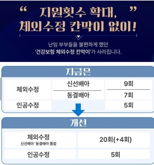 시술 간 칸막이 폐지로 신선·동결 구분 없이 20회의 체외수정과 5회의 인공수정 등 난임 지원 시술 횟수가 총 25회로 확대된다.