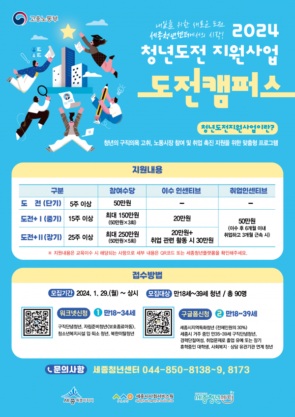 [금요저널] 세종시사회서비스원 소속시설 청년센터는 ‘2024년 청년도전지원사업‘도전캠퍼스’’ 참여자 90명을 상시모집 한다.