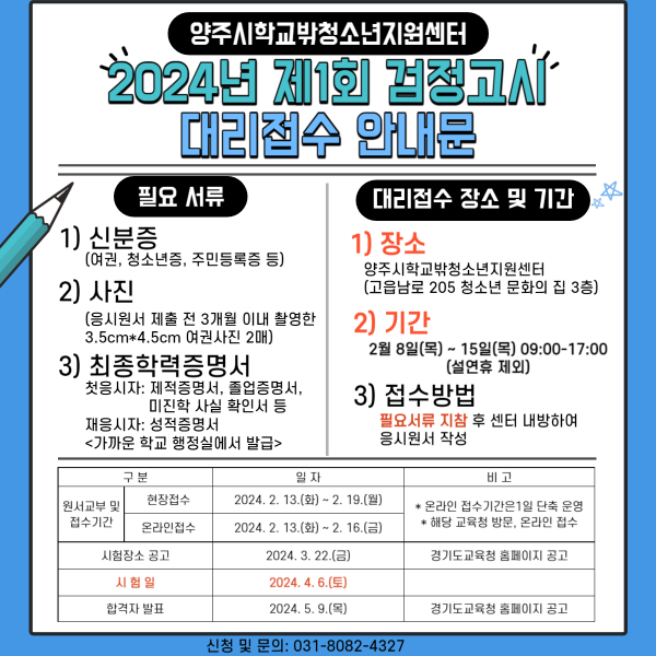 양주시 꿈드림은 오는 4월 6일에 시행되는 2024년도 제1회 검정고시에 오는 8일부터 15일까지 4일간 대리원서 접수가 진행된다.
