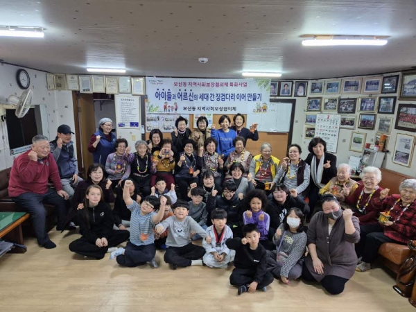 이날 진행된‘아이들과 어르신의 세대 간 징검다리 이어만들기’ 특화사업은 노인인구가 많이 거주하는 보산동 지역의 특성을 반영해 노년기 사회생활 감소로 외로움과 우울감을 호소하는 노인분들이 계신 경로당과 지역아동센터를 연계해 함께 소통하는 시간을 마련하고 유대관계를 형성하고자 추진됐다.