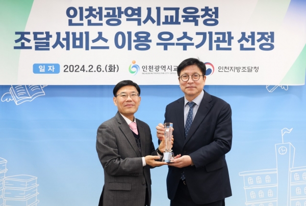 강신면 인천지방조달청장은 이날 인천시교육청을 방문해 우수기관 트로피와 표창장을 수여하고 조달서비스 이용에 감사의 뜻을 표했다.