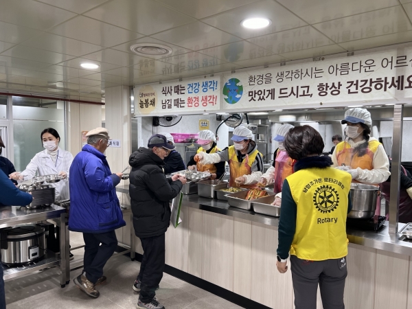[금요저널] 국제로타리 3600지구 남양주가운로타리클럽은 6일 설을 맞이해 동부노인복지관 이용 어르신 150명에게 떡만두국을 대접하는 행사를 가졌다.