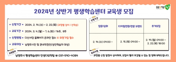 [금요저널] 남양주시는 2024년 상반기 평생학습센터 강좌 91개를 개설하고 오는 14일부터 22일까지 교육생 1,311명을 모집한다고 밝혔다.