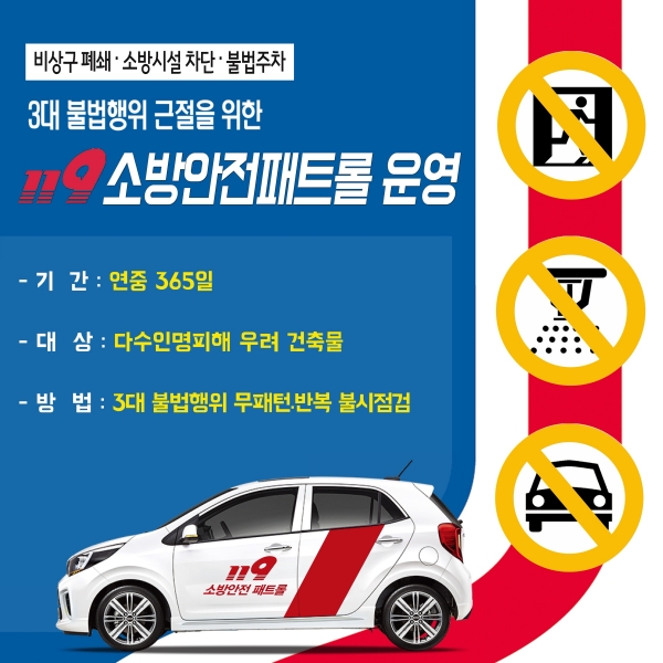 [금요저널] 남양주소방서는 ‘비상구 폐쇄, 소방시설 차단, 불법 주차’ 소방안전 3대 불법 행위를 집중 단속하기 위해 소방안전패트롤 단속반을 연중 운영중에 있다.