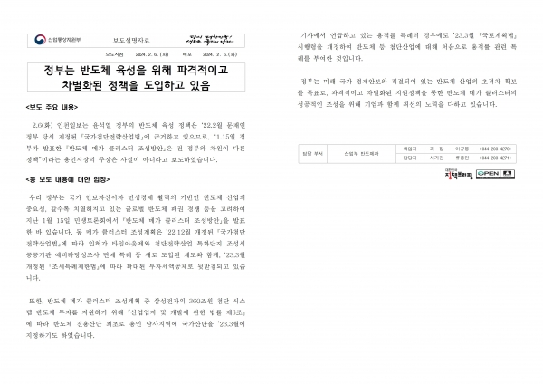 산업통상자원부는 지난 1월 15일 정부가 민생토론회에서 설명한 경기남부 반도체 메가 클러스터 조성과 관련해 인천일보에 언급된 인허가타임아웃제와 첨단전략산업 특화단지 조성 시 공공기관 예비타당성조사 면제특례 등 새로 도입된 제도는 문재인 정부 때가 아닌 현 정부 출범 이후인 2022년 12월에 개정된 국가첨단전략산업법에 따른 것이라는 지적도 했다.