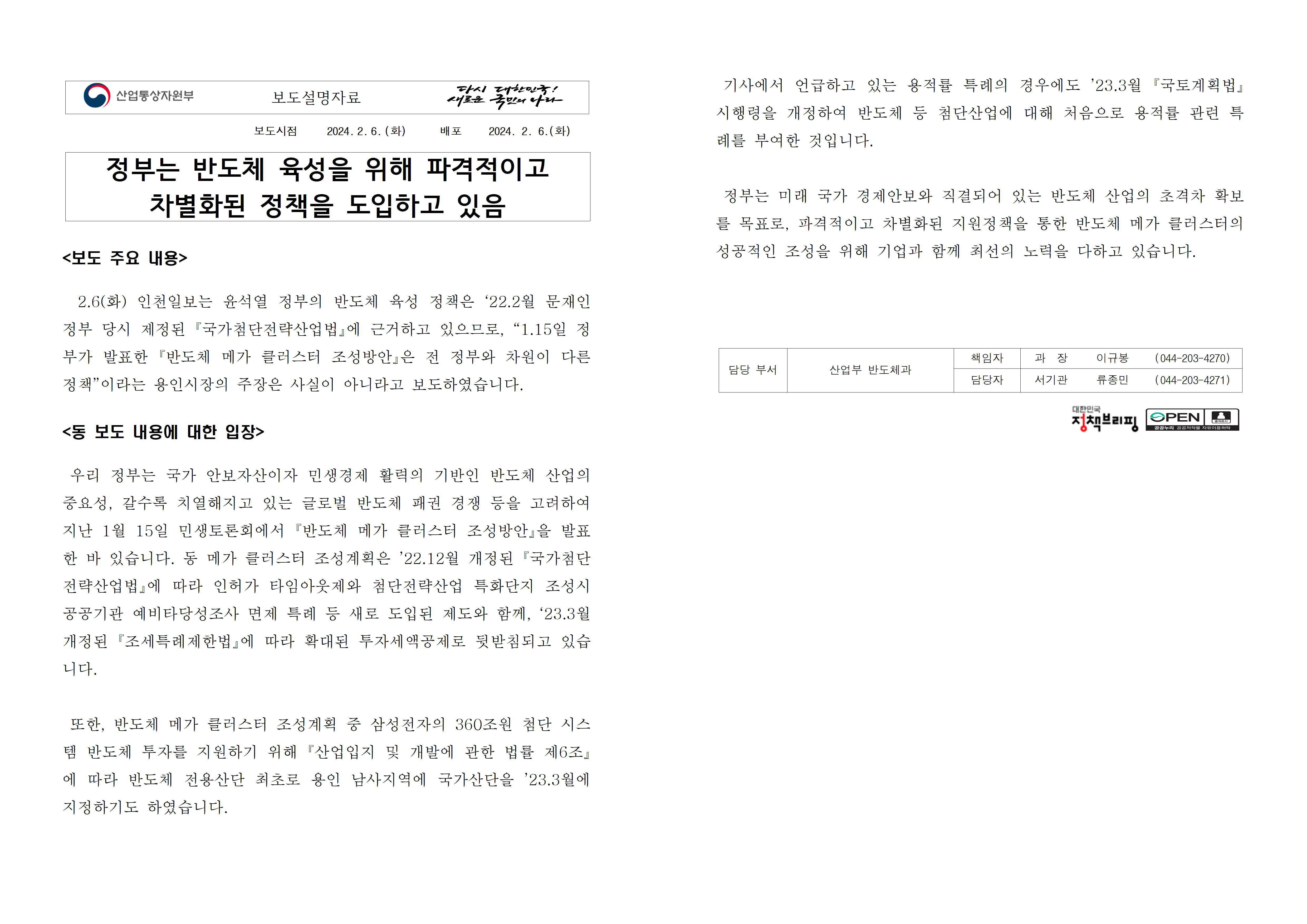 산업통상자원부는 6일 오후 이날자 인천일보 보도가 잘못됐다는 취지가 담긴 <정부는 반도체 육성을 위해 파격적이고 차별화된 정책을 도입하고 있음>이란 제목의 보도설명자료를 발표했다.