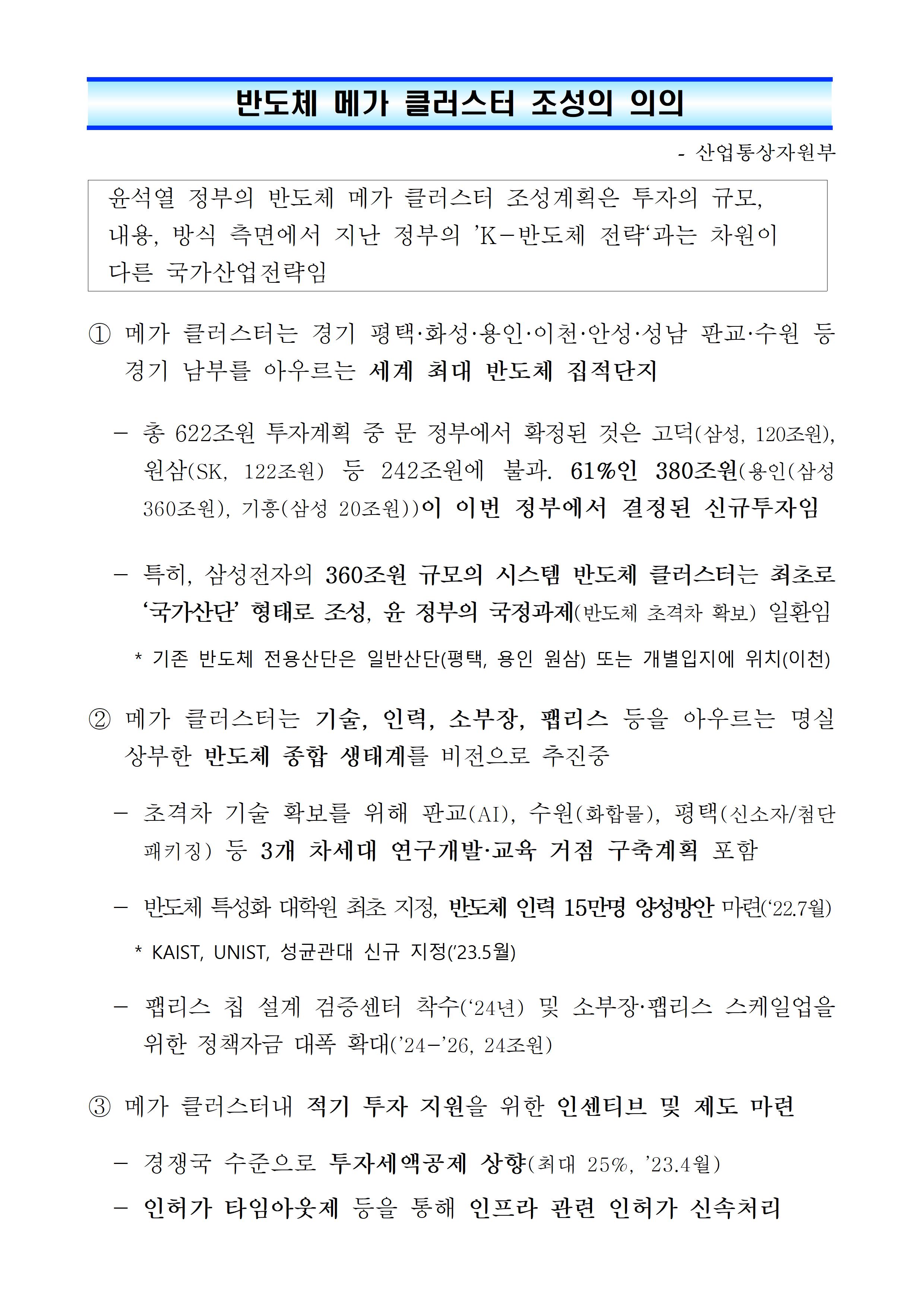 산업통상자원부는 보도설명자료에서 현 정부가 추진 중인 경기남부 반도체 메가 클러스터의 핵심인 용인 이동ㆍ남사읍 첨단 시스템반도체 국가산업단지 지정과 관련, "반도체 메가 클러스터 조성계획 중 삼성전자의 360조원 첨단 시스템 반도체 투자를 지원하기 위해 산업입지 및 개발에 관한 법률 제6조에 따라 반도체 전용산단 최초로 용인 남사지역에 국가산단을 2023년 3월에 지정했다"고 밝혔다.