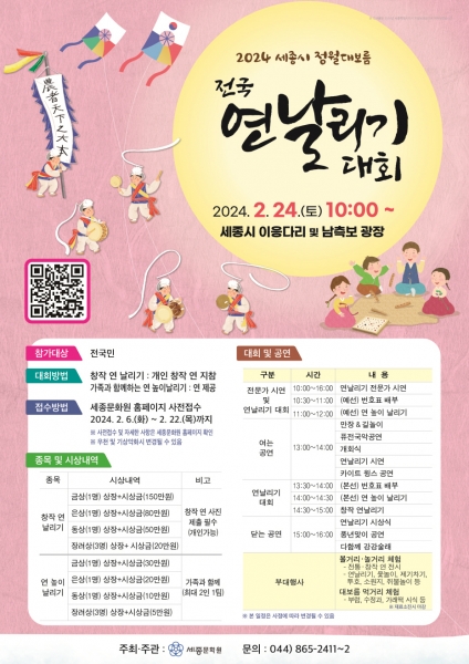 전국 연날리기 대회 참가 희망자는 8일부터 오는 22일까지 세종문화원 홈페이지에서 참가 신청이 가능하다.