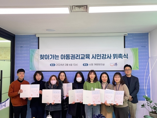 이날 위촉된 시민 강사들은 3월부터 12월까지 지역 내 초등학교를 비롯한 유치원, 어린이집, 돌봄시설 등 아동 관련 기관을 방문해 ‘찾아가는 아동권리 교육’을 진행하게 된다.