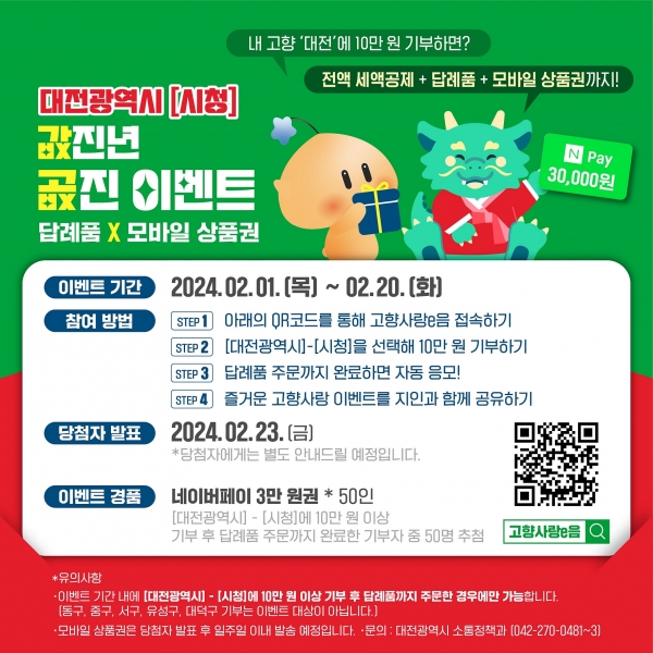 특히 2월 1일부터 2월 20일까지 대전 고향사랑 기부자 경품 이벤트를 하며 참여자 중 추첨을 통해 50명에게 모바일 상품권을 추가로 지급한다.