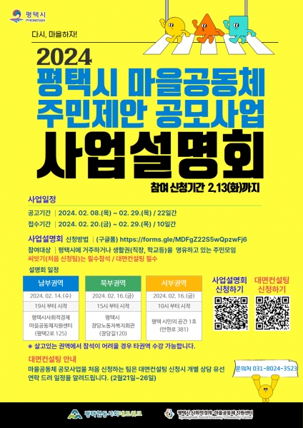아울러 공모와 함께 사전설명회를 개최하며 오는 14일 평택 사회적경제·마을공동체 지원센터에서 오후 7시에, 16일에는 10시 서부의 평택 시민의공간 1호에서 같은 날 오후 3시에는 북부권인 장당노동자복지회관 대회의실에서 진행할 예정으로 참가자 사전 접수가 진행 중이다.