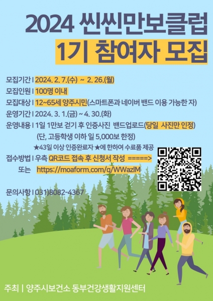[금요저널] 양주시 동부건강생활지원센터에서는 오는 26일까지 시민의 1일 1만보 건기를 위해 ‘2024 씬씬만보클럽 1기 참여자’를 모집한다고 13일 밝혔다.